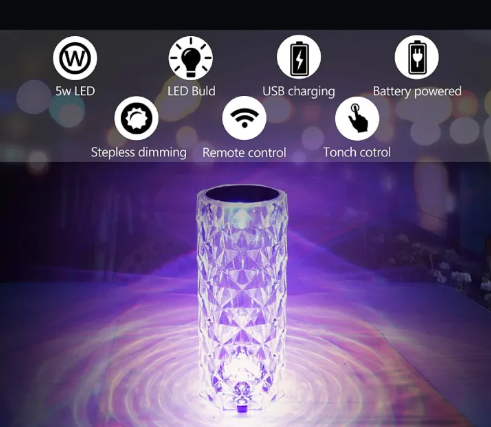 Bring elegance and sparkle to your space with the Crystal Rose Diamond Lamp. Designed with a luxurious crystal-cut rose shape, it casts dazzling light patterns that instantly enhance any room’s atmosphere. Enjoy 16 stunning color options that you can easily change using the included remote control or simple touch sensor. With USB rechargeable convenience, this lamp is perfect for bedrooms, living rooms, romantic dinners, parties, or as a thoughtful gift.