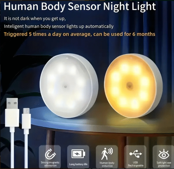 Indoor Motion Sensor Night Light – USB rechargeable 8-LED lamp with switch, perfect for closets, stairs, corridors, bedrooms, and kitchens.